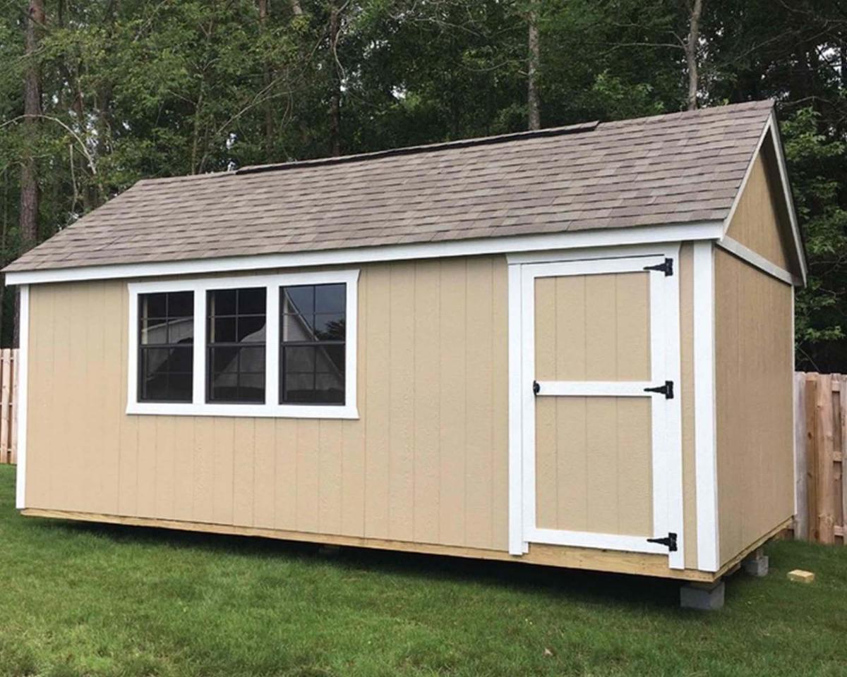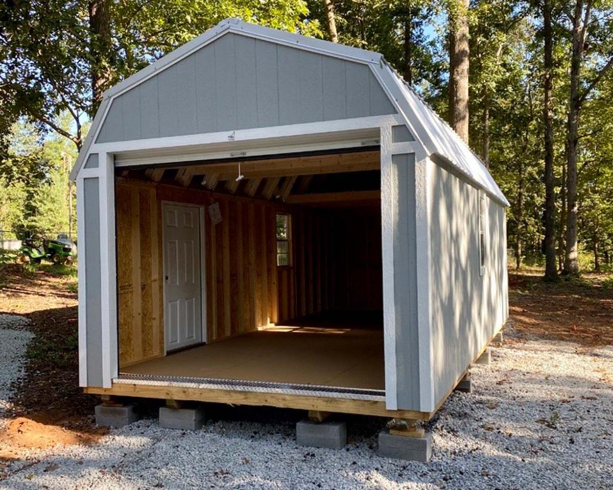 - Our storage buildings are delivered to your location fully assembled and put into place with a truck and dump trailer, similar to what is shown in the picture.